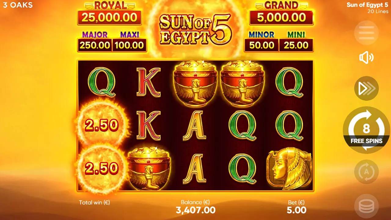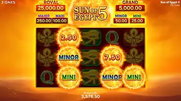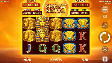 The Royal Jackpot is awarded when you fill all 15 positions on the reels with Sun symbols during the Hold and Win bonus round. It's the ultimate prize in Sun of Egypt 5!