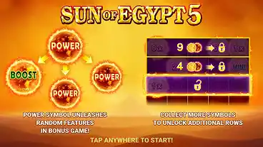 The horizon burns in Sun of Egypt 5, the scorching new chapter in the famed Ancient Egypt saga. This release fans the flames of excitement with fresh features, from game-changing Power Symbols to expanding reels that open the adventure wider than ever. At the game's core lie chances to win one of six fixed Jackpots.